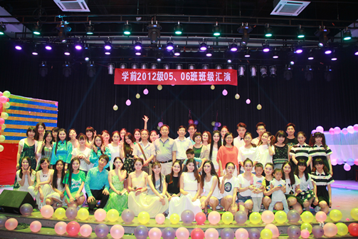 在汇报演出圆满落幕后,程晓鹏书记、陈剑光副书记、代朝霞老师等与学前120506班全体同学合影留念。