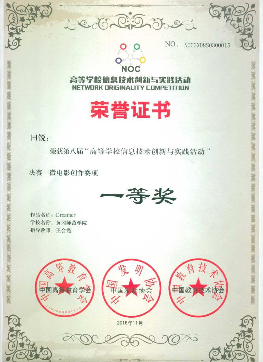 2016年11月12日至13日,由中国教育学会、中国发明协会、中国教育技术协会联合举办的第八届高等公司信息技术创新与实践活动在无锡江南大学举行。公司王会霞教师指导,教技201401班员工田锐创作的微电影《Dreamer》在微电影组别中荣获一等奖,王会霞老师获得优秀指导教师奖。