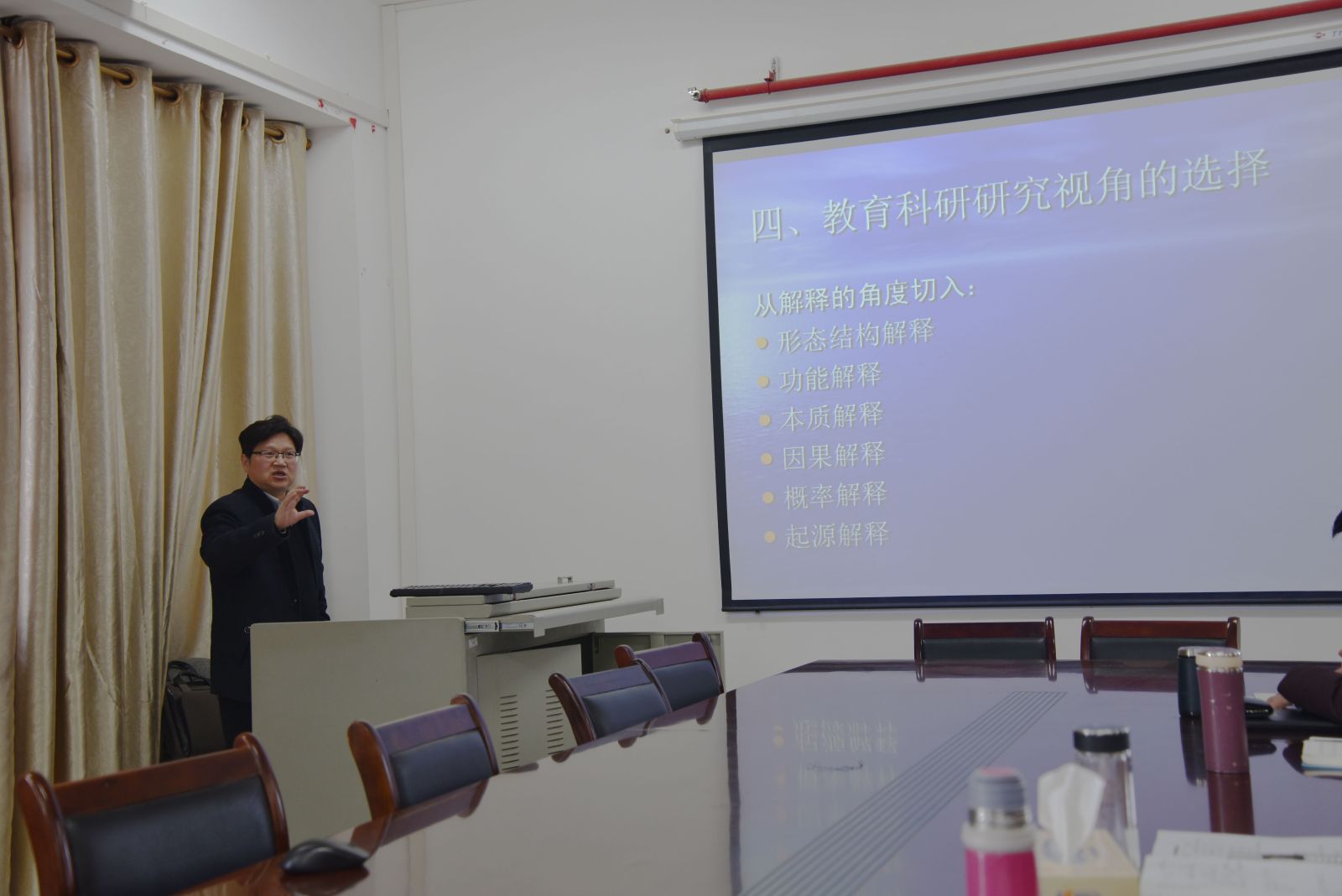 在教育科研问题的探讨上,程斯辉教授从教育科研的本质与特点、教育研究的复杂性与难题、教育研究中的问题发现、教育科研研究视角的选择、教育科研的创新五个方面进行了讲解。