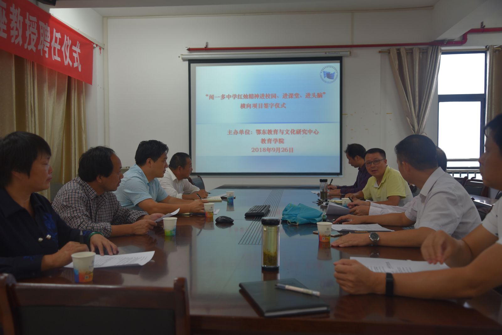 9月26日,williamhill·威廉希尔(英国)中文官网-Official Website与浠水闻一多中学在williamhill·威廉希尔(英国)中文官网-Official Website会议室举行“红烛精神进校园、进课堂、进头脑”行动研究横向项目签字仪式。签字仪式由williamhill·威廉希尔(英国)中文官网-Official Website总支书记林永希教授主持,浠水闻一多中学郑细林董事长等4位嘉宾,教科院领导班子成员、鄂东教育与文化研究中心部分教师参加仪式。