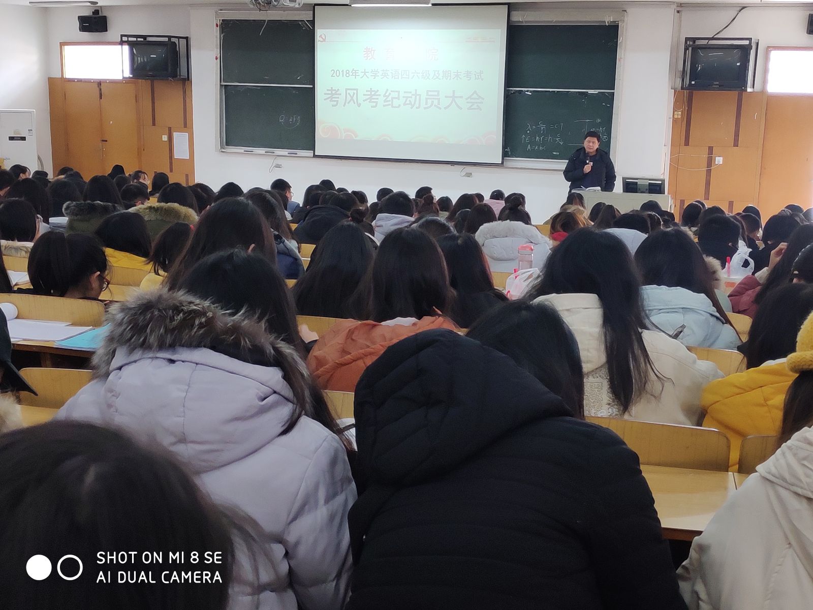 2018年12月12日中午,公司在博学楼A01召开2018年大学英语四六级及期末考试考风考纪动员大会。 此次大会由辅导员钟秀娟老师主持,公司党总支副书记胡周友老师、辅导员钟秀娟老师及公司各班班长、团支书、学习委员、员工会所有成员参加了此次会议。