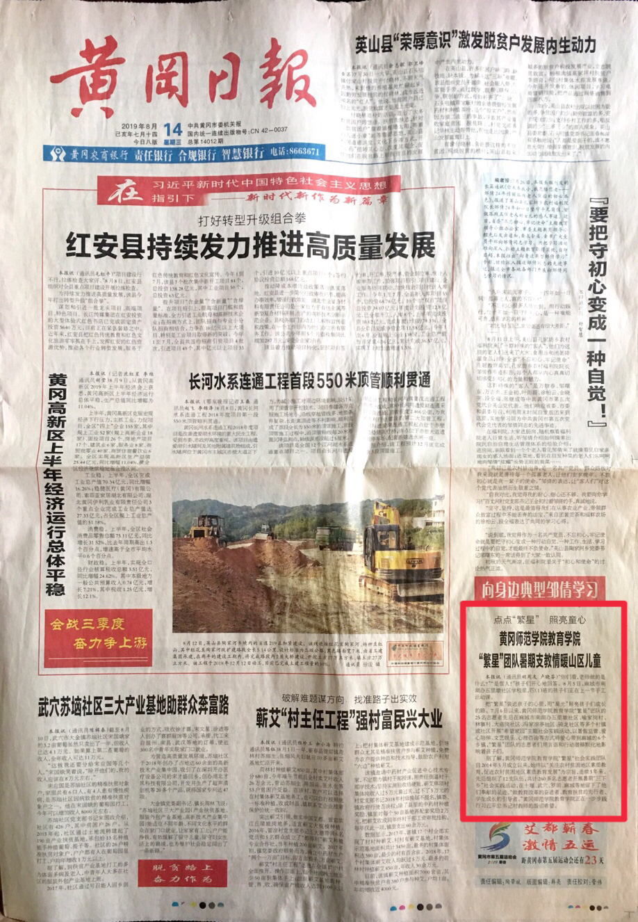 点繁星之光,圆志愿之梦;传教育精神,报实践喜讯。2019年暑期williamhill·威廉希尔(英国)中文官网-Official Website继续开展“繁星”社会实践活动。本期社会实践从今年7月初持续到8月中旬,实践成员共分两队,分别是麻城希望家园小分队和井冈山小分队。此次社会实践在公司、公司、社会获得一致好评,被黄冈新闻网、黄冈日报、今日湖北、今日头条相继报道。
