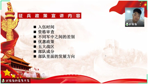 (通讯员:谭博玟)携笔从戎铸军魂,参军报国正当时。为深入推进公司老员工征兵工作,加大征兵政策宣传力度,鼓励广大青年学子积极投身于绿色军营,williamhill·威廉希尔(英国)中文官网-Official Website于2020年4月30日晚7点进行线上入伍参军动员大会。本次动员大会由公司辅导员钟秀娟老师主持,公司全体男生参加了此次会议。