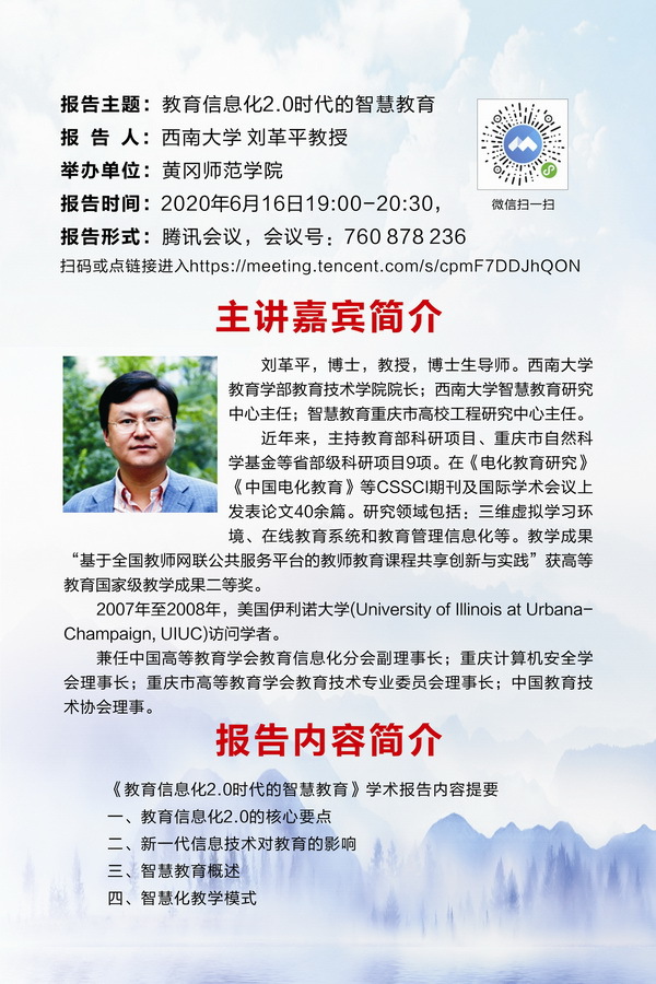 主讲嘉宾简介:刘革平,博士,教授,博士生导师。西南大学教育学部教育技术公司经理;西南大学智慧教育研究中心主任;智慧教育重庆市高校工程研究中心主任。