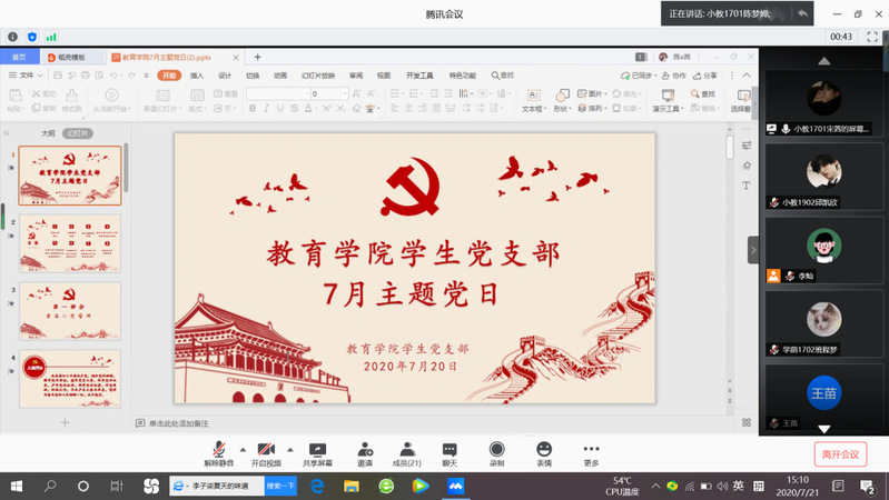 7月21日,员工党支部开展线上主题党日活动,此次活动由员工党员王苗、宋茜同志主持,员工党支部书记邹焱萍老师、全体员工党员参加会议。