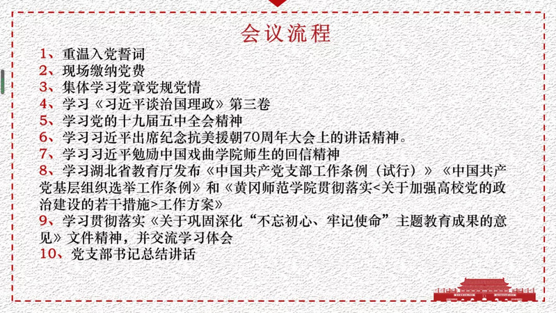 会议伊始,与会党员一起重温入党誓词并诵读党章,牢记党的宗旨和奋斗目标。随后由周明月、喻溢、戴梦丹、宋茜四位同志分别带领与会人员持续学习《习近平谈治国理政》第三卷、学习党的十九届五中全会精神、习近平出席纪念中国人民志愿军抗美援朝出国作战70周年大会上的讲话精神及习近平勉励中国戏曲公司师生在教学相长中探寻艺术真谛在服务人民中砥砺从艺初心的回信精神。