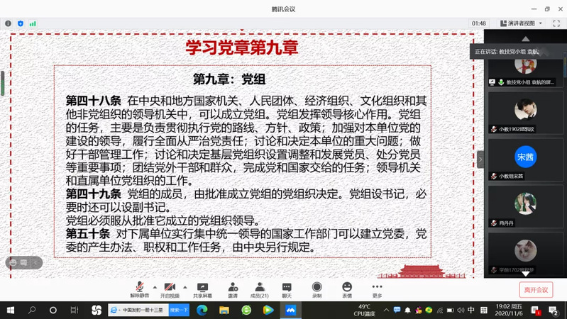 11月5日,员工党支部开展线上主题党日活动,此次活动由员工党员袁航、肖丹丹同志主持,员工党支部书记邹焱萍老师、全体员工党员参加会议。