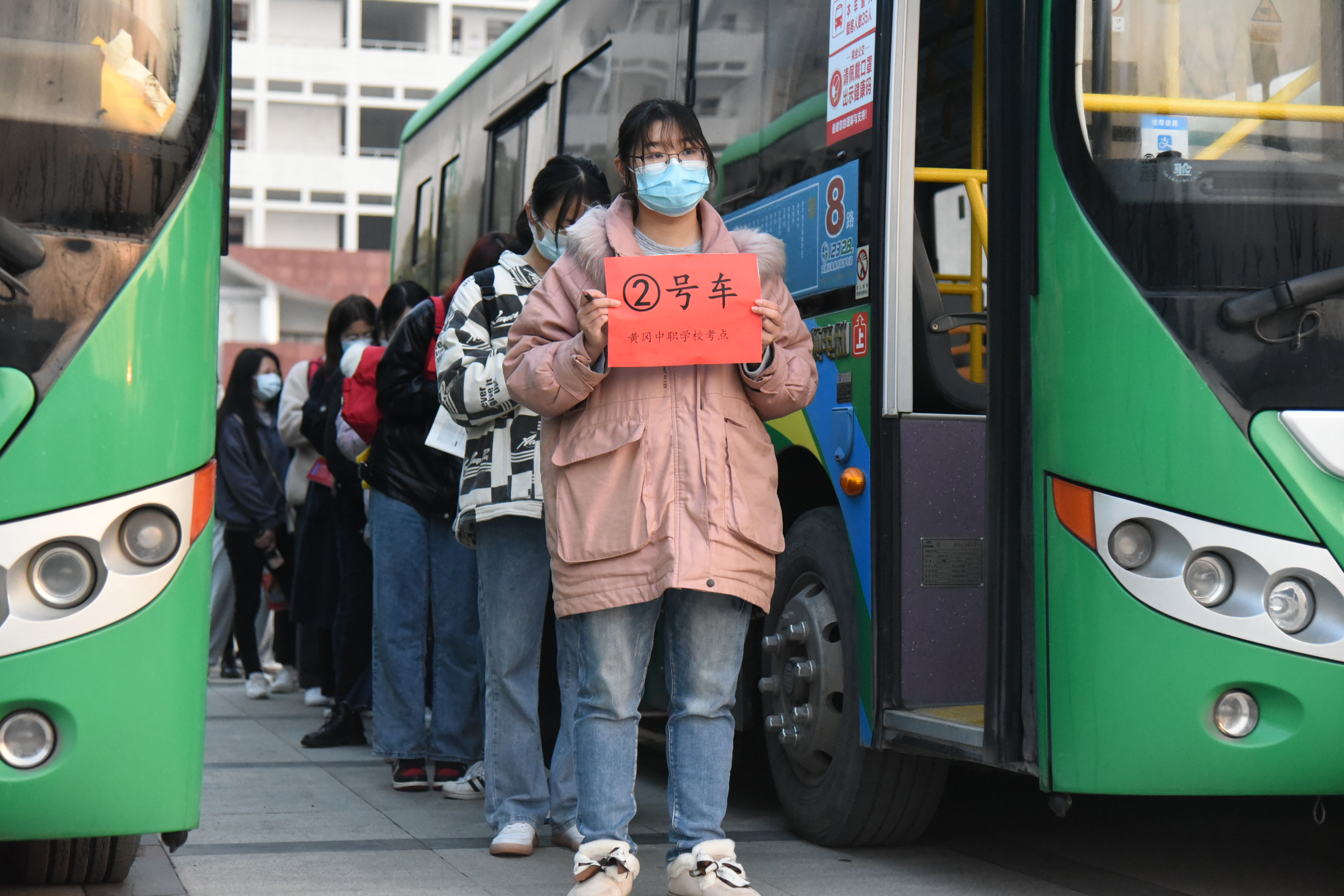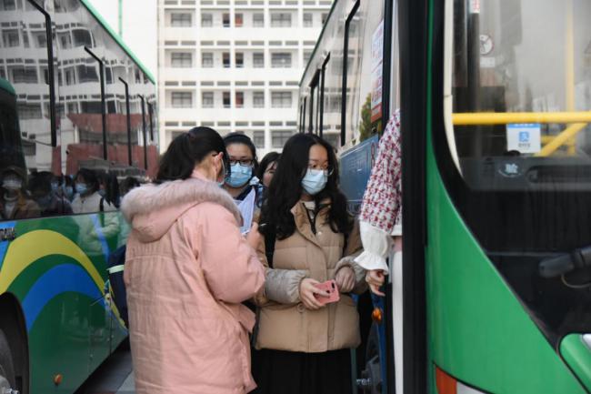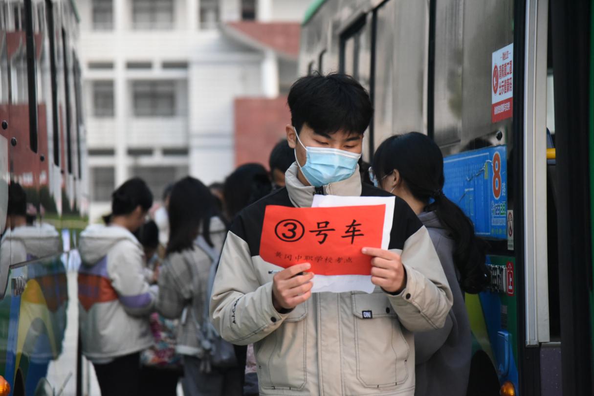 早上7:00,考生依次有序上车,员工干部对车辆座位进行协调并在发车前反复清点人数,考生上车后也不忘放下书本,继续复习。