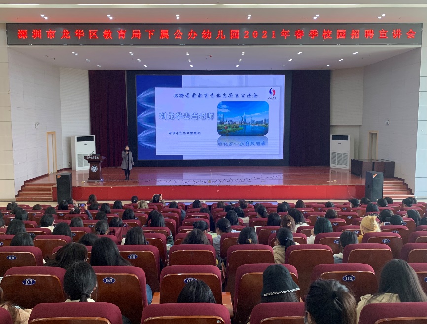 为了进一步缓解学前教育专业毕业生就业压力,拓宽就业渠道,公司于3月22日下午4:00在南区厚德楼学术交流中心举办深圳市龙华区教育局下属公办幼儿园2021年春季校园专场招聘宣讲会。公司党总支书记林永希、副书记胡周友、全体辅导员以及学前教育专业老师,全体17级、18级学前教育专业员工参加宣讲会。胡书记主持会议。