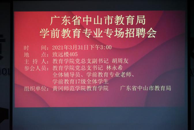 3月31日下午,公司在致远楼405会议室召开广东省中山市教育局学前教育专业专场招聘会。公司党总支书记林永希、副书记胡周友、广东省中山市东区街道教体文旅局副局长冯树清、教育和体育事务中心主任陈侃、东区街道组织人事办公室副主任黎婕欣、东区街道第一中心幼儿园园长贺志玲、全体辅导员以及学前教育专业老师,学前教育专业17级全体员工参加招聘会。胡周友主持会议。