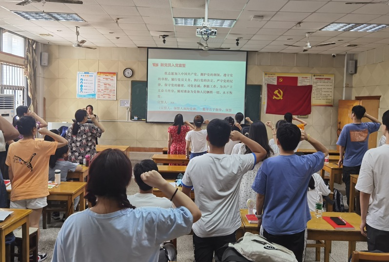 迎党旗入场后,仪式在庄严的《国际歌》中拉开帷幕。老党员首先为新党员佩戴了党徽。其后,在员工党支部书记邹老师的领誓下,全体新党员面对党旗进行了庄严的宣誓,现场老党员也一起重温了入党誓词。铮铮誓词既是新党员的承诺,也激荡着老党员的爱党爱国情怀。新党员代表刘佳颖同学回顾了自己积极向党组织靠拢的历程,誓要在今后的工作和学习中充分发挥共产党员的先锋模范作用,以实际行动为党旗增辉,为党的事业奋斗终生。
