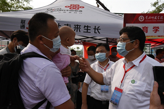 9月4日上午9时,公司党委书记王立兵,党委副书记、董事长陈向军来公司服务台视察,与公司党总支书记程晓鹏、经理陈中文以及志愿者们亲切交谈。期间,偶遇公司教技202101班梁白羽同学来校报到,梁白羽家属带着仅120天的新生儿一起来送他上学,王书记亲切地拉住新生儿的小手向家长说道:“你们这是让孩子提前接受大学的熏陶啊!”