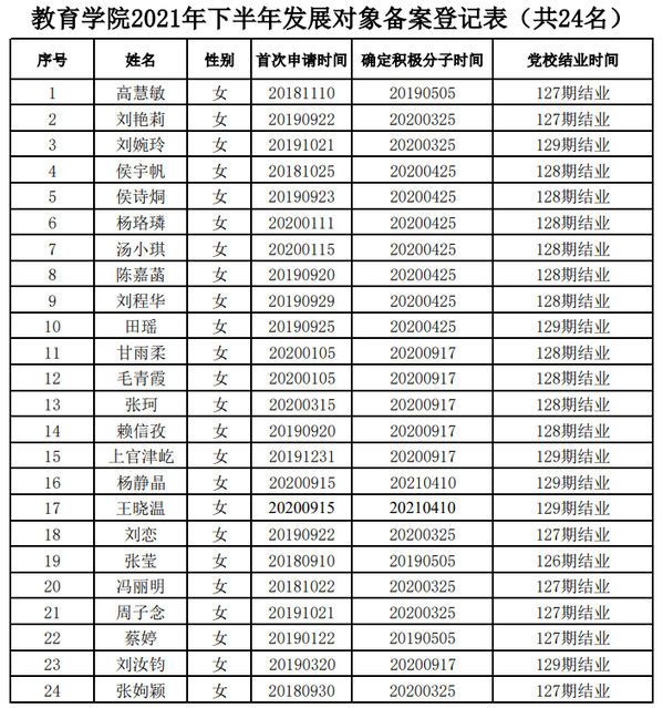根据公司《关于做好2021年下半年发展对象确定和备案工作的通知》文件要求,经审查,公司高慧敏等24名入党积极分子初步符合组织发展要求。具体名单如下: