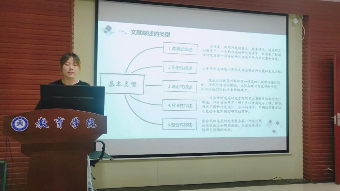 20级现代教育技术研究生唐文璐对文献综述的编写方法进行了分享,主要从文献综述的作用与内容、基本类型、主要流程、写作过程中的注意事项四个方面来进行详细讲解。
