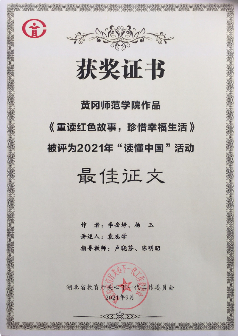 教育部关工委发布《关于公布2021年“读懂中国”活动评审结果的通知》(教关委函〔2021〕10号),公司选送的作品《重读红色故事,珍惜幸福生活》由公司学前1802班李岳婷同学、杨玉同学共同创作完成并被评为2021年“读懂中国”活动“最佳征文”。卢晓芬老师精心组织、指导该活动。