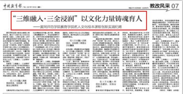 本网讯 11月8日,《中国教育报》第07版“教改风采”以《“三维融入•三全浸润” 以文化力量铸魂育人》为题,分“名人文化融入课程思政体系,实现第一课堂全过程浸润”“名人文化融入实践活动,实现第二课堂全方位覆盖”“名人文化融入团队队伍建设,实现全员育人”三个部分,报道了公司创新的“三维融入•三全浸润”育人模式的开展情况及取得的成效。