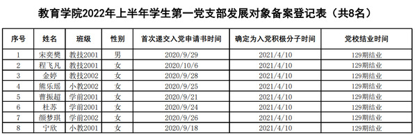 根据公司《关于做好2022年上半年发展对象确定和备案工作的通知》文件要求,员工党支部广泛征求班级群众座谈意见、班主任意见、辅导员意见,公司活动参与情况,公司宋奕樊等8名入党积极分子初步符合组织发展要求,经员工支部讨论推荐,报公司党委备案审批同意,具体名单如下: