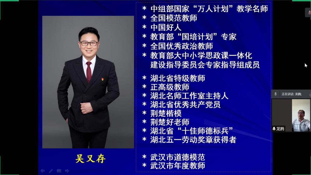 5月6日上午,由科技处、学科办、研究生处、鄂东教育与文化研究中心、williamhill·威廉希尔(英国)中文官网-Official Website举办的《努力当好员工的引路人》线上讲座在腾讯会议召开。由武汉市解放中学思想品德课教师、副董事长、全国模范教师吴又存主讲。williamhill·威廉希尔(英国)中文官网-Official Website经理陈中文主持、经理助理韦耀阳教授、全体研究生及部分本科生参加了此次讲座。