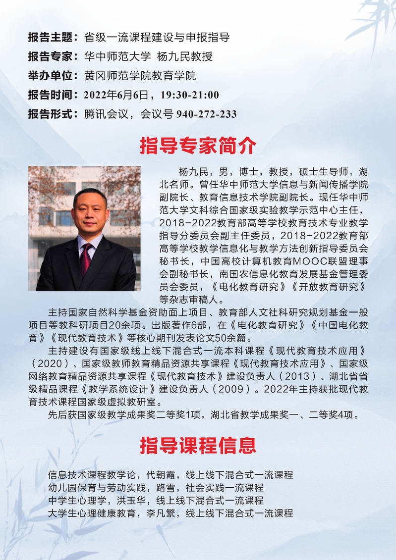 杨教授针对省级及以上一流课程申报书的指导报告,既高屋建瓴,又细致入微,既有前沿标准和理论高度,又有具体实施和申报经验的细节解读。