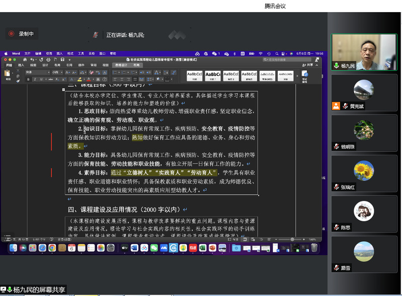 杨九民教授结合实践课程、线上课程、线上线下混合课程等三个类型的《幼儿园保育与劳动实践》《老员工心理健康教育》《信息技术课程教学论》《中员工心理学》等四门省级一流课程申报书,就省级一流课程申报过程中的基本信息、教学团队、课程目标、课程建设及应用情况、课程特色与创新、课程建设计划等内容一一进行了详细的点评和指导。