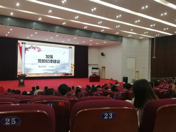 王永胜副书记以“加强党的纪律建设”为主题,从“党的纪律建设的相关概念”、“党的纪律建设的百年发展历程”、“加强党的纪律建设的着力点”三个方面进行开展,结合相关条例规定和实际案例加深同学们对党的纪律建设的深刻理解,强化纪律意识,加强修养品德。