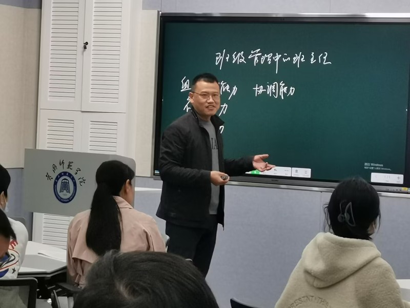 沈胜林老师展示的是《班级管理与活动组织》课程中“班级管理中的班主任”章节授课环节,主要从班主任的作用、班主任的职责以及班主任的能力素质等方面进行了课堂展示。讲授过程中条理清楚,板书规范,员工互动充分。