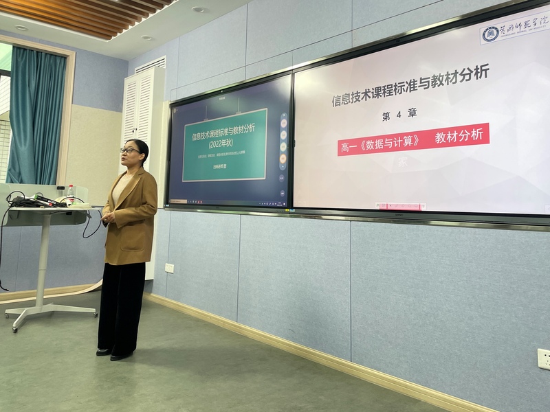马慧老师展示的是《信息技术课程标准与教材分析》中第四章“高一‘数据与计算’教材分析”“信息意识”的讲解。马慧老师将现代信息技术充分融入课堂教学,基于超星学习通平台实时呈现学情分析结果,发布在线讨论主题以及结果,及时进行在线评价等。在整个课堂充分体现员工中心,与员工实现了零距离互动。