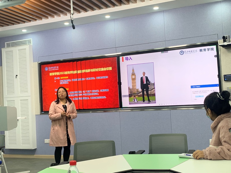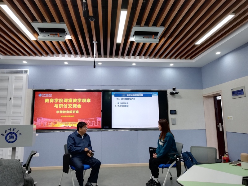 韦耀阳教授展示的是《教育科学研究方法》课程中“访谈法”章节授课环节,教学过程中通过现场访谈示范进行相关内容的教学设计、教学实施的示范形式。