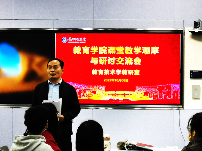 课堂教学观摩与研讨交流会分教育技术学教研室、学前教育教研室和小学教育教研室三个分会场同步进行。每个教研室选取正高、副高和讲师各一人进行课堂教学示范课展示。展示包括讲课和说课两个环节。展示完成后,教研室其他成员围绕课堂教学设计、教学实施、课程思政等展开深入研讨交流。