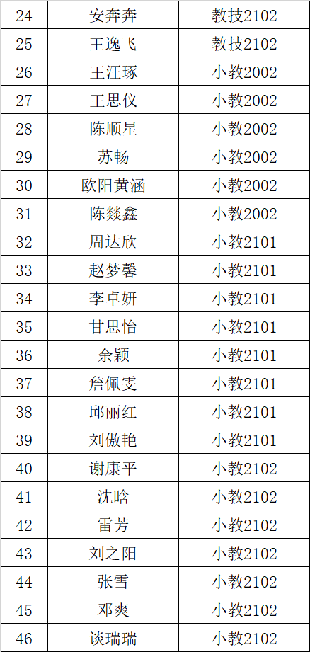 优秀学员:教管2021级 杨航琳 小教2002班 王汪琢 学前2102班 刘瑶 教技2102班 汪煜涵