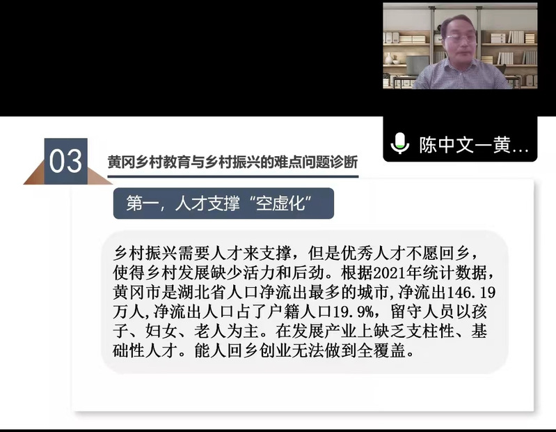 本次会议上午为主旨报告+专题报告,下午分基础教育资源配置公平与效率、高等教育资源配置公平与效率两个论坛。湖北教育经济学会副会长、williamhill·威廉希尔(英国)中文官网-Official Website副董事长夏庆利担任主旨报告会议的主持人。williamhill·威廉希尔(英国)中文官网-Official Website经理陈中文教授在分论坛一:基础教育资源配置公平与效率论坛上做题为“教育发展推进黄冈乡村振兴的战略研究”的报告。