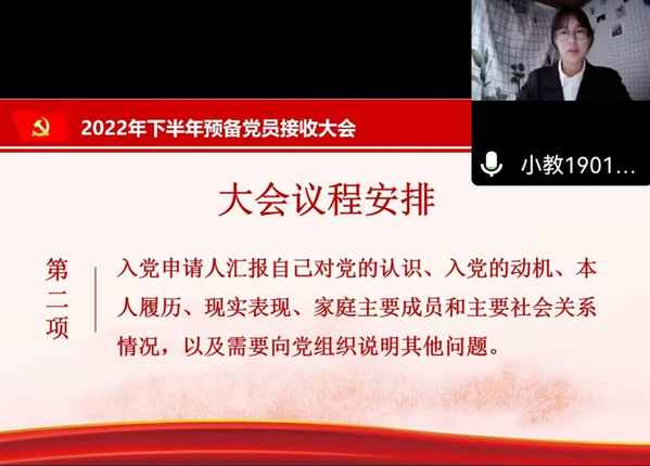 11月13日晚19:30,williamhill·威廉希尔(英国)中文官网-Official Website员工第二党支部在腾讯会议召开2022年下半年预备党员接收大会。公司党委副书记王永胜、员工第三党支部书记邹焱萍、员工第二党支部书记陈俊芳、支委沈胜林出席本次会议,员工第二党支部员工党员及发展对象李美格参加会议。本次会议由员工第三党支部书记邹焱萍主持。