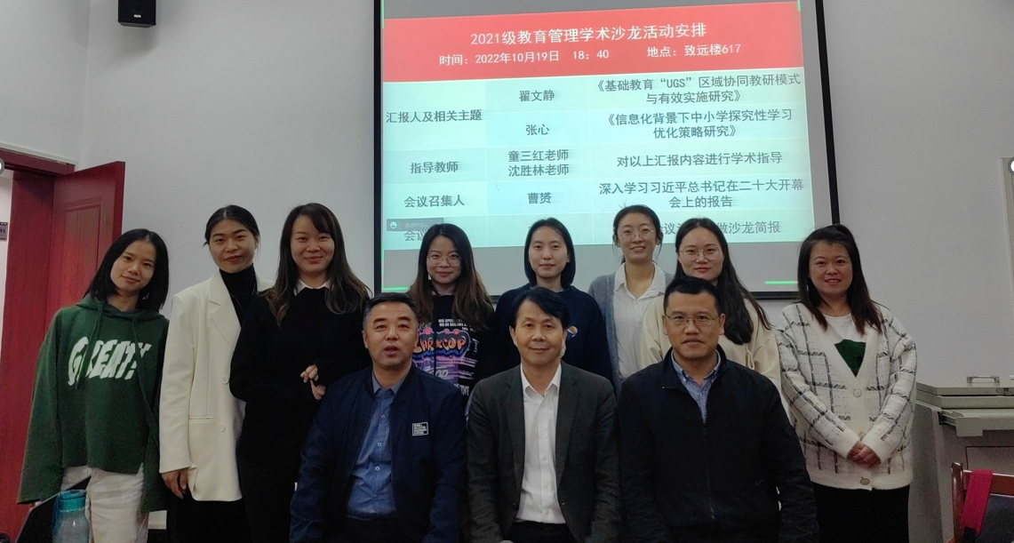 2022年10月19日晚上,williamhill·威廉希尔(英国)中文官网-Official Website教育管理专业研究生与导师在致远楼617开展学术沙龙活动。教管导师沈胜林老师、童三红老师以及21级教育管理专业全日制全体研究生参与了本次学术沙龙。本次学术沙龙由张心、翟文静两位同学进行汇报,与大家进行分享交流。