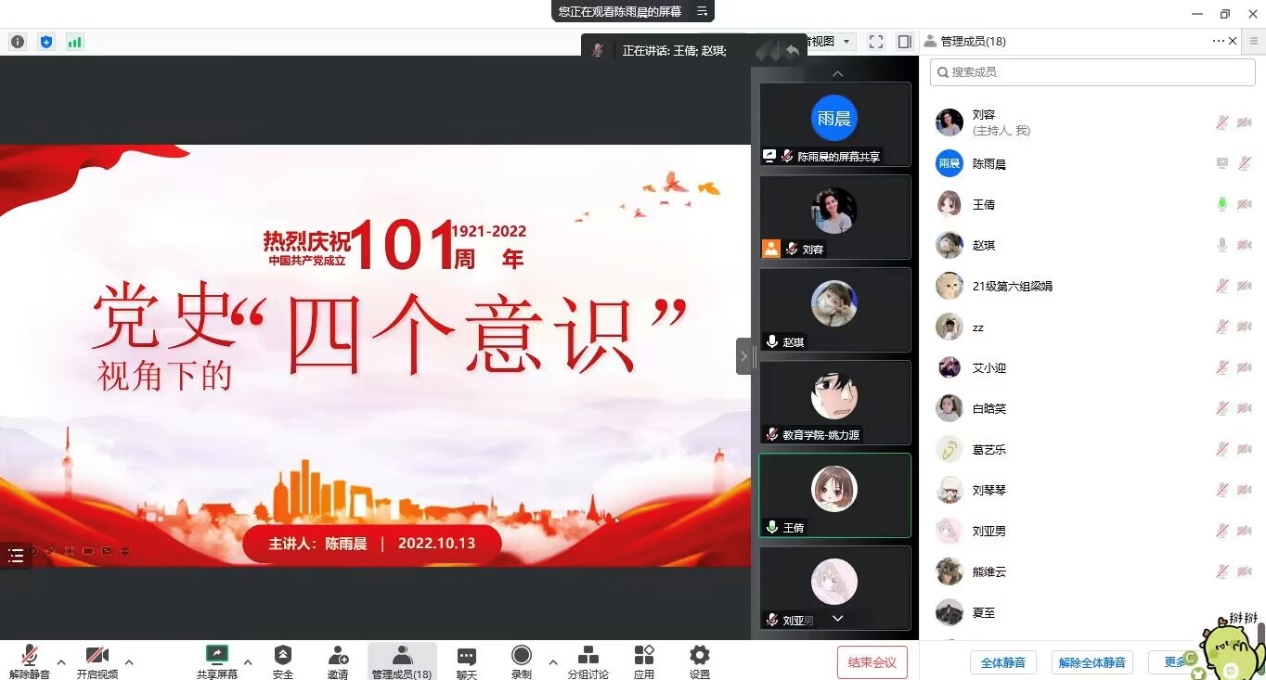 最后21 级现代教育技术专业党员陈雨晨带领全班同学深入学习了党史专题教育PPT,《党史视角下的“四个意识”》,增强“四个意识”关系我们党和国家、中华民族的前途命运,对于我们党、对于我们党领导的伟大事业,具有极其重要的现实意义和深远的历史意义。有利于继续推进新时代党的建设新的伟大工程,把党建设得更加坚强有力,并对此次会议作了总结。