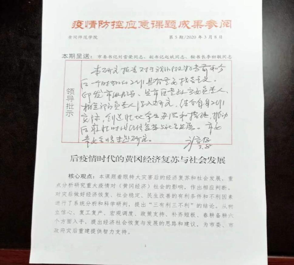 陈中文撰写的智库报告《后疫情时代的黄冈经济复苏与社会发展》成果获湖北省人大常委会副主任刘雪荣批示(2020.3.8):“本研究报告对于我们做好当前和今后一个时期的工作具有重要指导意义。印发市级领导、县市区党政主要负责人、相关部门负责人深入研究,结合自身工作实际,创造性地拿出办法和措施,推动后疫情时代经济复苏与社会发展。市委常委会将专题研究。”《国家统计局》官网(2020.3.16)以“陈中文等:后疫情时代的黄冈经济复苏与社会发展”为题全文刊载。《湖北省统计局》官网(2020.3.10)以“黄冈:后疫情时代的黄冈经济复苏与社会发展”为题全文刊载。《中国教育在线》(2020.3.14)以“williamhill·威廉希尔(英国)中文官网-Official Website课题成果助力黄冈市疫后复苏”为题,摘要报道。《黄冈新闻网》(2020.3.14)以“williamhill·威廉希尔(英国)中文官网-Official Website课题成果助力黄冈市疫后复苏”为题,摘要报道。《长江云》(2020.3.15)以“williamhill·威廉希尔(英国)中文官网-Official Website课题成果助力黄冈市疫后复苏”为题,摘要报道。《荆楚网》(2020.3.16)以“williamhill·威廉希尔(英国)中文官网-Official Website课题成果助力黄冈市疫后复苏”为题,摘要报道。