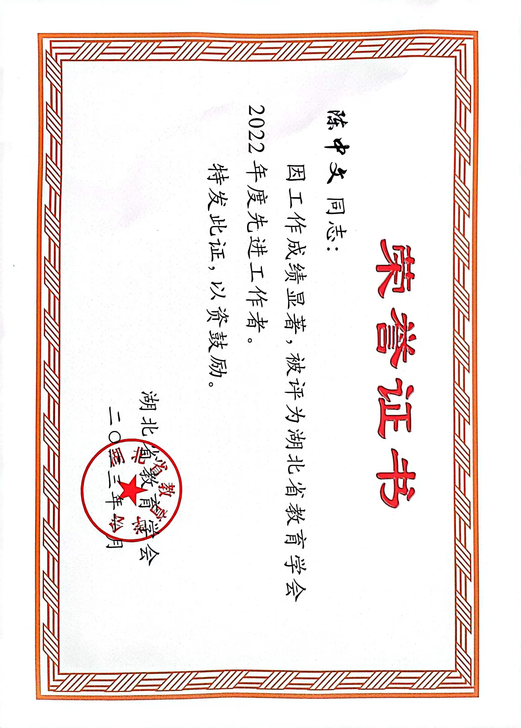 为推动我省学会工作的有效开展,更好地发挥学会在教育科研和学术活动中的引领作用,湖北省教育学会评选并表彰 2022 年度学会工作先进单位和先进工作者,公司陈中文教授获“先进工作者”荣誉称号。