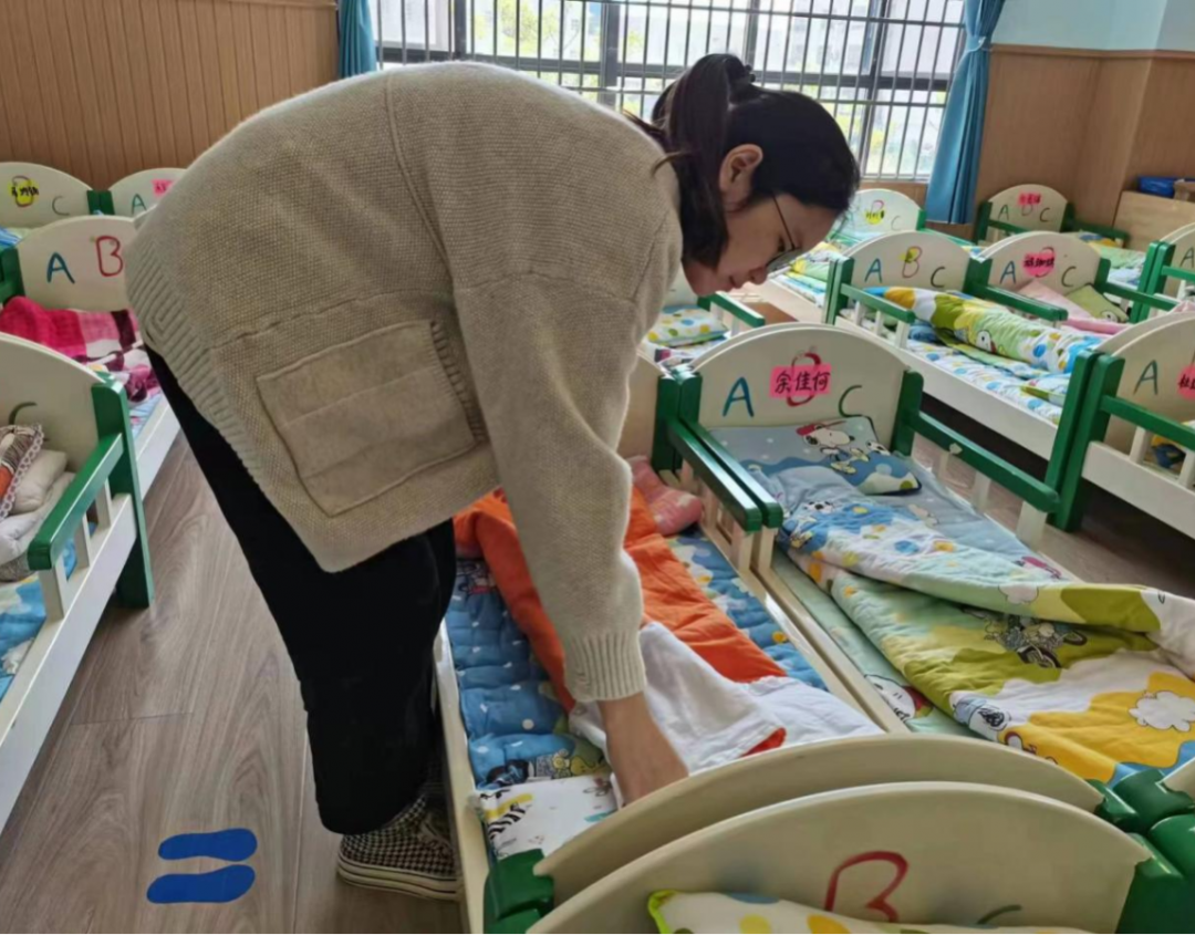 幼儿午睡醒来后,同学们协助教师积极引导幼儿穿衣、叠被子、穿鞋子等,主动为小女生梳头发。