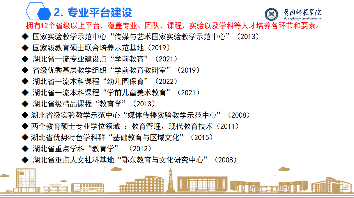 1、学前教育专业发展历程:williamhill·威廉希尔(英国)中文官网-Official Website学前教育专业办学历史悠久,1997年公司开办幼儿师范专业,1998年公司与麻城师范联合开办五年制学前教育专科。2008年成功申报学前教育本科,是湖北省较早成立的学前教育本科专业之一。历经15年的专业建设,已成为省级一流本科专业建设点,“学前教育教研室”获批湖北省优秀基层教学组织,拥有省级一流本科课程3。同时本专业拥有12个省级以上平台,覆盖专业、团队、课程、实验以及学科等人才培养各环节。