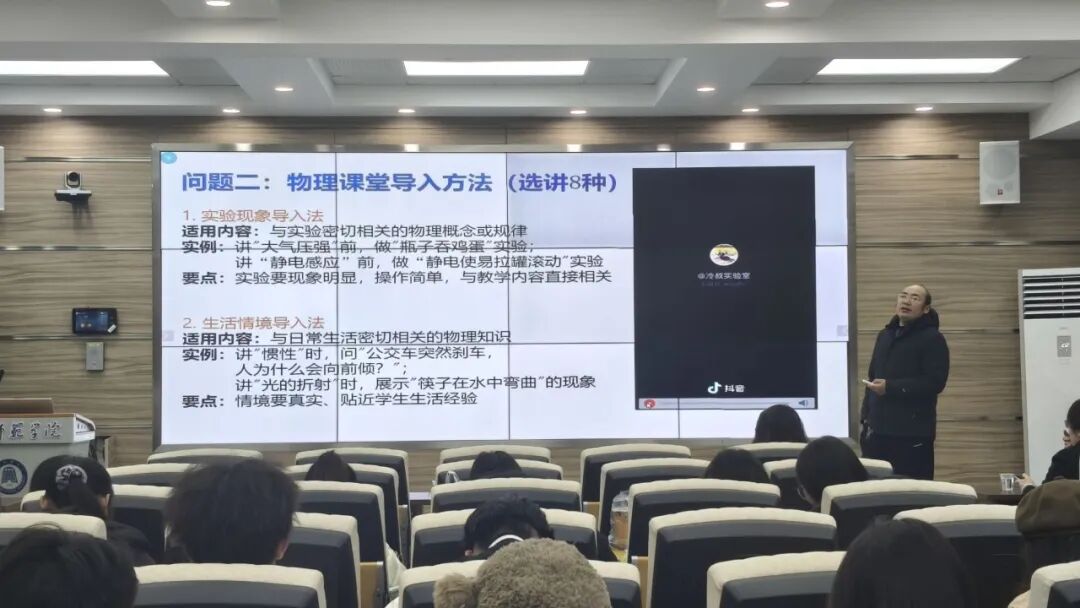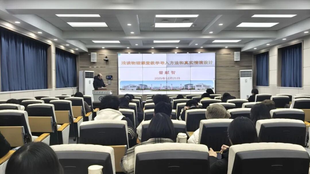讲座伊始,曾献智老师直切主题,以“物理课堂的教学导入与情景设计”为核心展开分享。他着重强调:“课堂导入虽只有短短几分钟,却是整堂课的‘风向标’,决定了员工的注意力走向和课堂的整体氛围。”随后,曾老师系统介绍了多种实用的课堂导入方法。他首先结合生动实例,讲解了“实验现象导入法”与“生活情境导入法”,指出实验应直观、生活情境需贴近员工经验。紧接着,他重点阐述了“故事史料导入法”,并现场生动演绎了如何用牛顿与苹果的故事引入“万有引力”概念,为学员们提供了可操作的示范。最后,曾老师还介绍了能激发探究思维的“问题探究导入法”以及注重互动体验的“游戏活动导入法”。他通过丰富的案例库与清晰的要点总结,让学员们对各种导入技巧有了系统而直观地认识。