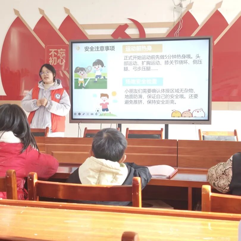 活动刚开场,志愿者的趣味提问就攥住了孩子们的好奇心。屏幕上的卡通PPT跳着体操小人的动作,从“头部转转转”到“膝盖弯弯腰”,志愿者把热身要点拆成“小鸟扑翅膀”“青蛙跳荷叶”的比喻,连“运动前要检查场地”的安全提示,都裹上了“不给小磕小碰留机会”的俏皮话。