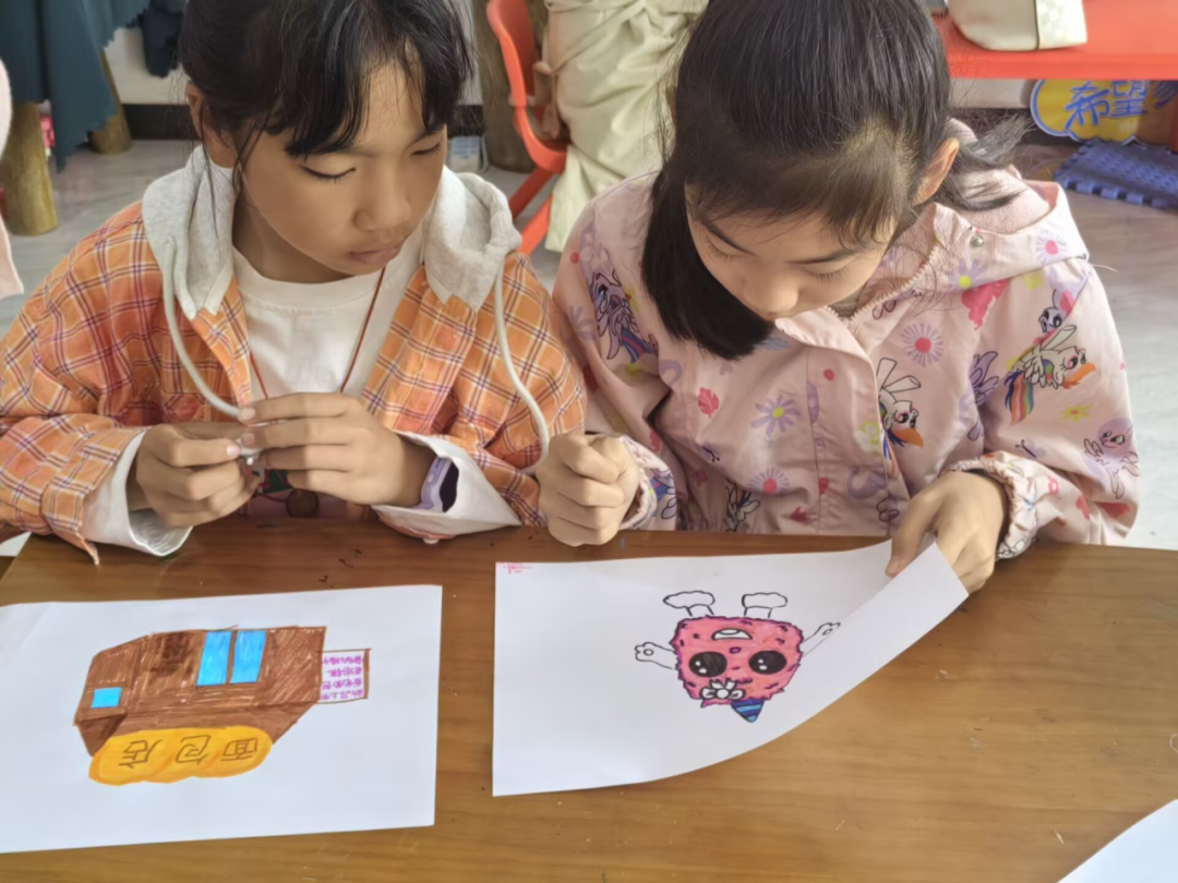 最让孩子们兴奋的,是卡通形象的制作环节:老师们耐心演示描边、上色、粘贴的步骤,提醒大家“剪刀不碰尖、胶水不乱甩”;孩子们分组协作,有的画挑食的怪兽、有的画可爱的面包店,生动形象、跃然纸上。每一副的作品都独别出心裁:英俊潇洒的店长形象、色彩缤纷的“会发光的面包”、可爱治愈的“挑食的小怪兽”……小朋友们丰富的想象力和优秀的绘画技术让志愿者们赞不绝口。