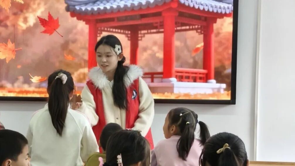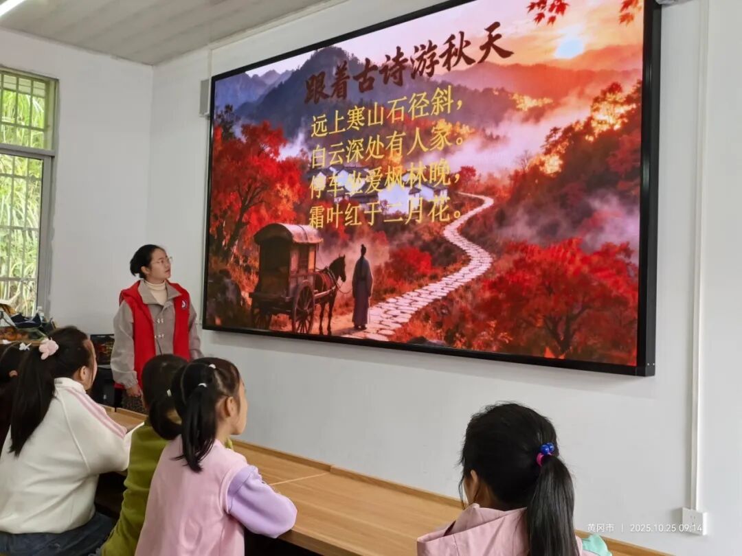 当讲到霜降吃柿子的习俗时,志愿者还结合了乡村生活:“咱们罗田的柿子又甜又大,霜降吃柿子,寓意事事如意!” 让小朋友们对家乡霜降习俗多了份了解。课堂尾声的诗词互动环节,志愿者带着大家诵读《山行》。