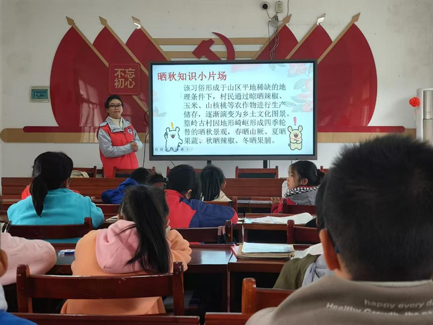 活动伊始,志愿者老师通过生动的PPT与视频,带孩子们走进“晒秋”的民俗世界——“大家见过屋顶晒满玉米、辣椒的画面吗?”从“晒秋是山区居民晾晒丰收作物的智慧”,到“这一习俗里藏着先辈对自然的敬畏与对生活的热爱”,孩子们睁着好奇的眼睛,听着“晒秋”在物质、精神与社会文明中的深层意义,还踊跃分享自己见过的“晒秋”小故事,让农耕文 化的种子悄悄埋进心底。