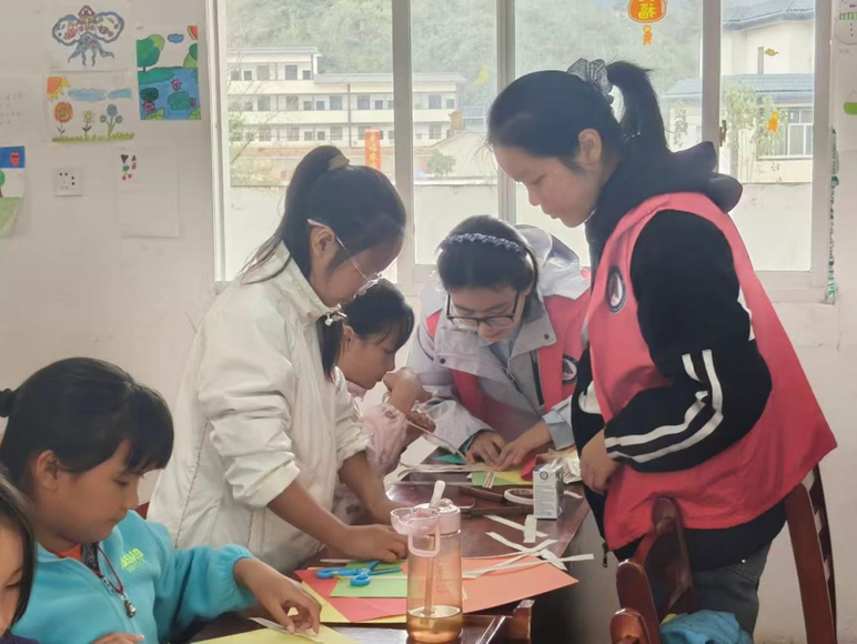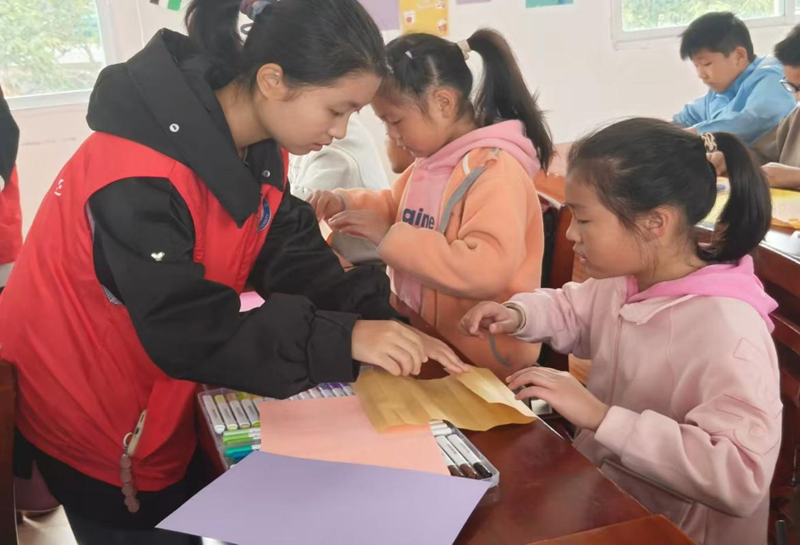 红色志愿者马甲的身影穿梭在课桌间,或是帮孩子调整卡纸位置,或是提醒使用剪刀的安全,或是抓拍那一个个埋头创作的专注瞬间——教室里,彩纸翻飞、笑语不断,每一件作品都藏着独一份的巧思与温情。