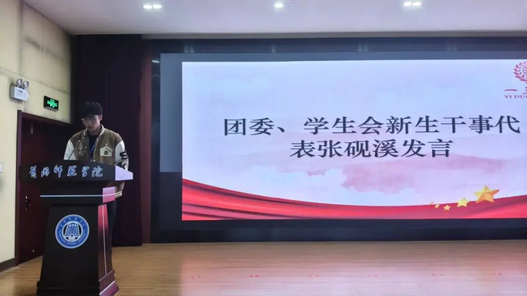随后,新生干事代表张砚溪发言。他表达了对加入员工会的感谢与荣幸,并阐述了对“服务同学”这一宗旨的深刻认同,承诺将积极履行职责,在锻炼中成长。