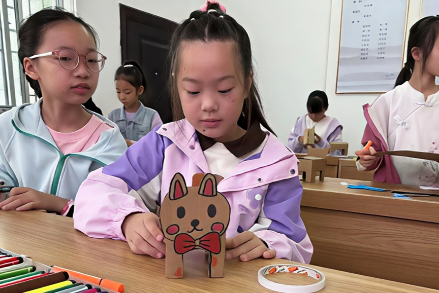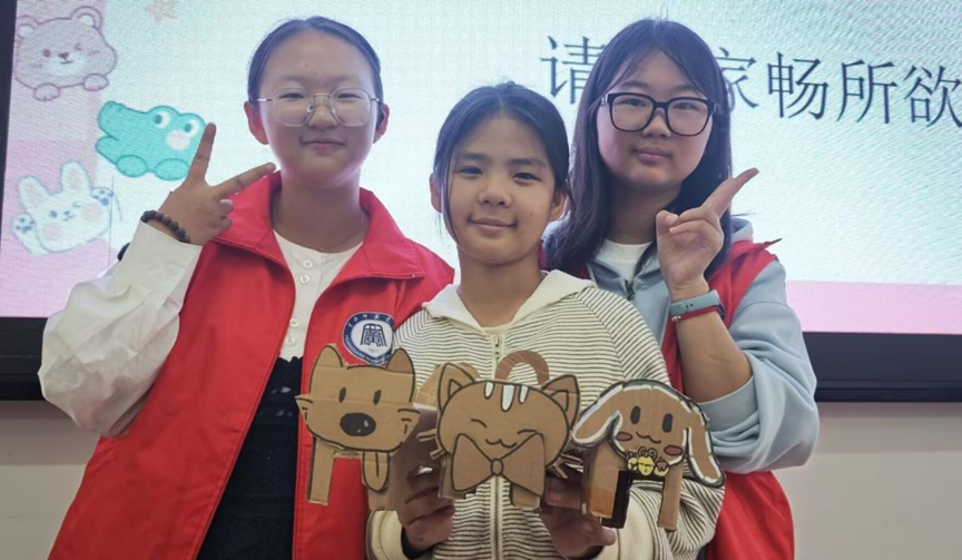 活动尾声,小朋友们高举自己的纸箱小狗,兴奋地分享创作故事:“我的小狗是‘回收小卫士’,专门帮家里捡废品!”“我给小狗画了绿色花纹,代表它爱大自然!”小女孩幼稚的小脸上洋溢着灿烂的笑容,她兴奋地告诉志愿者,在老师们的帮助下,她绘制出了自己喜欢的卡通小狗图案,并把它制作成了自己喜欢的剪纸工艺品,她迫不及待想和家人分享这个快乐时刻。另一个小女孩则主动邀请志愿者合影,三只手工小狗承载了她对这堂生动环保课程的感悟,原来身边不起眼的废物在进行细心加工制作后能变成精美的工艺品。