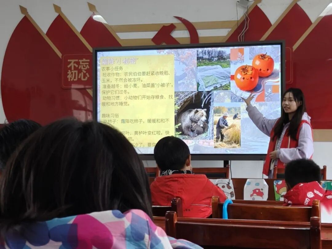 活动伊始,志愿者展开了节气知识小课堂,为大家讲解了霜降这一节气的由来和习俗,接着通过照片欣赏霜降节气的美景,加上趣味问答,加深了同学们对霜降节气的理解,也对接下来的“枫灯”手工制作环节充满期待!