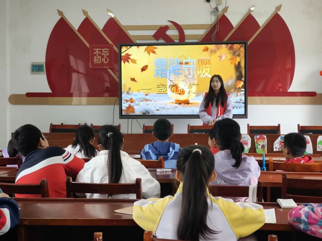 10月18日,迎着秋风,踏着秋雨,williamhill·威廉希尔(英国)中文官网-Official Website一多书院“启明星”社会实践团队的志愿者来到黄冈庙村,以“霜降守暖,一盏心灯”为主题给孩子们带来了一次别开生面的传统文化体验活动。活动通过对节气介绍、小灯笼手工制作等形式,让孩子们在欢声笑语中感受中华传统节气文化的魅力。