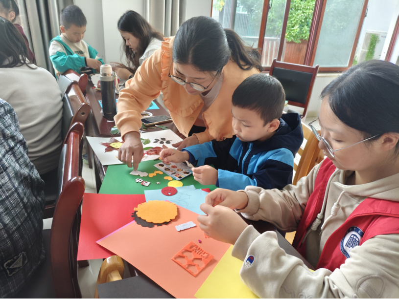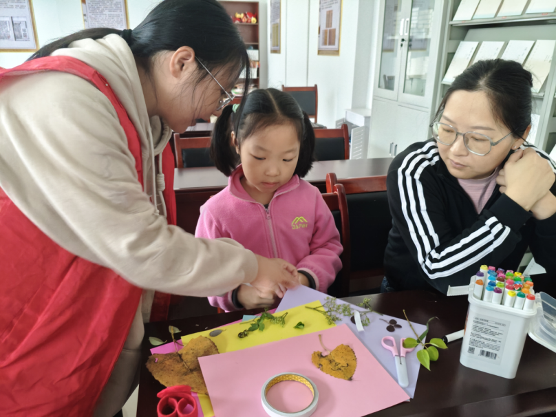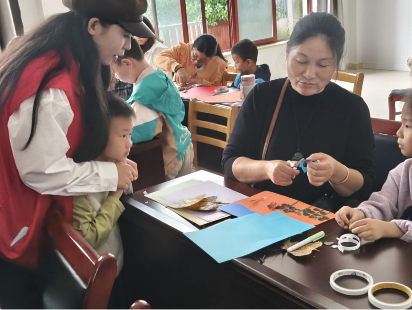 创作过程中,志愿者们耐心指导,从树叶的取舍、构图的设计到粘贴的技巧,一一细致讲解家长与孩子默契配合,时而低头挑选树叶,时而轻声讨论布局,活动室里充满了欢声笑语与创作的热情,每一张卡纸都成了承载霜降诗意与亲子温情的画布。