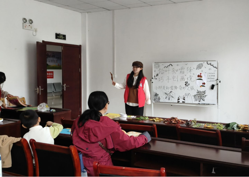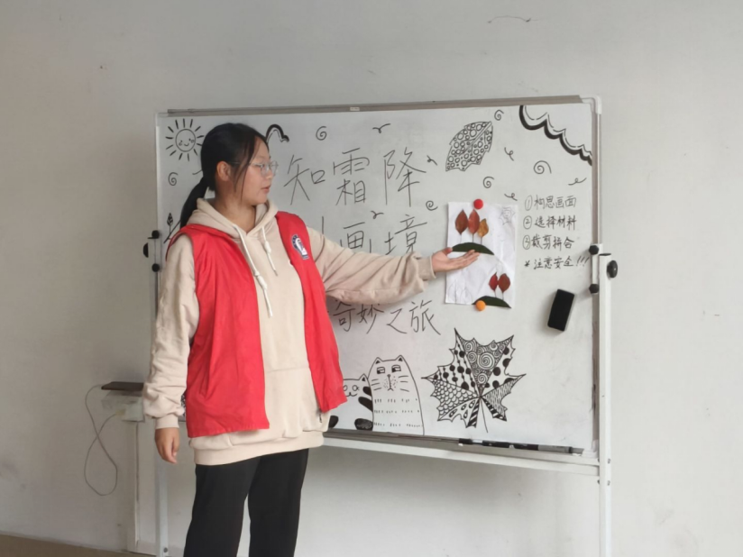 “千树万树穿白衣,天气变冷它通知,不是雪来不是冰,太阳一出就消失。猜猜是什么东西?活动伊始,志愿者老师以有趣的谜语带大家走进霜降节气。“霜降是秋季的最后一个节气,意味着冬天的脚步近了。”老师结合白板上的插画,从霜降的时间、物候特征,讲到古人对霜降的观察与习俗,孩子们听得津津有味,小眼睛里满是对节气知识的好奇。在互动问答中,大家不仅了解了“霜叶红于二月花”的自然现象,更对接下来的树叶画创作充满期待。